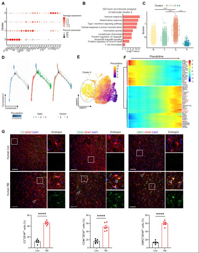 (A) 點圖展示TBI患者與對照組星形膠質細胞亞群中典型標記基因的表達。