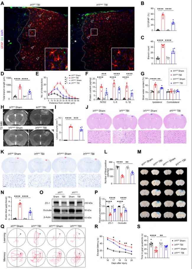 圖5:星形膠質細胞條件性敲除Irf1降低促炎表型、緩解BBB破壞與腦水腫,并促進TBI后神經功能恢復