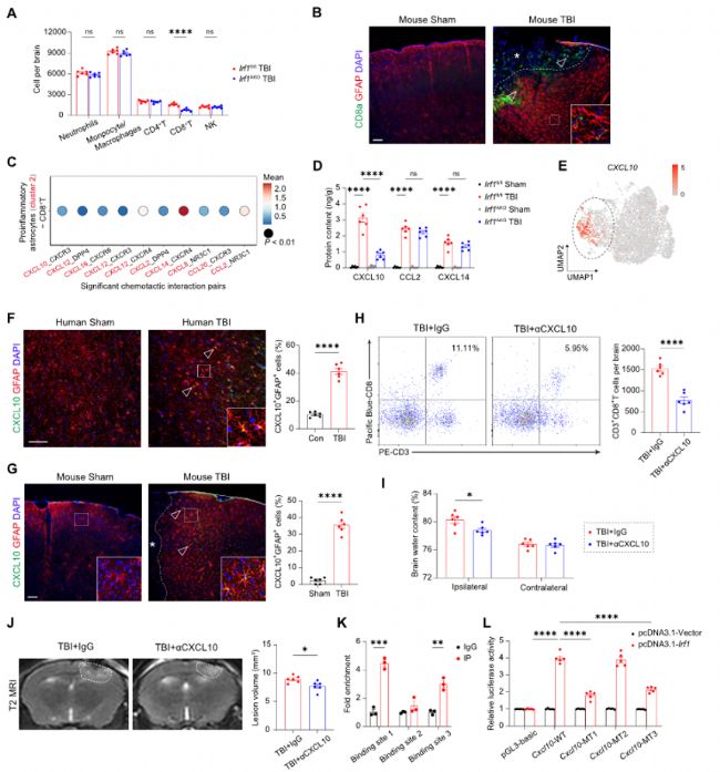 通過細胞間互作分析,研究發現IRF1+星形膠質細胞與CD8+ T細胞之間存在顯著CXCL10/CXCR3互作。在TBI小鼠模型中,IRF1敲除顯著降低CXCL10表達,減少了CD8+ T細胞的浸潤,并減輕腦水腫。通過免疫熒光染色,研究者確認CXCL10在TBI患者和小鼠模型中的表達,并發現其主要由星形膠質細胞分泌。