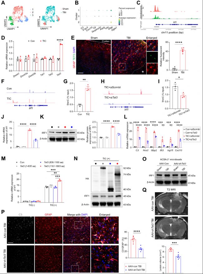 (O) Western blot分析TBI或假手術后第3天,經shTet3 AAV或對照AAV轉導的分離星形膠質細胞中IRF1蛋白表達。