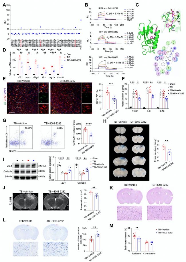 通過計算機輔助藥物設計,研究者從1667101個化合物中篩選出IRF1拮抗因子8003-3282,并通過表面等離子體共振(SPR)分析確認其與IRF1的高親和力。在體外實驗中,8003-3282顯著抑制了星形膠質細胞的促炎表型,并減輕了神經毒性。在TBI小鼠模型中,8003-3282干預顯著減少了促炎星形膠質細胞的激活、CD8+ T細胞的浸潤、腦水腫和腦損傷體積,并改善了神經功能恢復。
