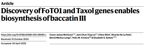 2025年6月11日,斯坦福大學(xué)的 Elizabeth S. Sattely 等人在 Nature 雜志發(fā)文,宣布其開發(fā)了一種“多重?cái)_動(dòng) × 單核轉(zhuǎn)錄組(mpXsn)”技術(shù),在復(fù)雜的紫杉基因組中高分辨率地識(shí)別出紫杉醇生物合成通路的多個(gè)關(guān)鍵模塊,首次發(fā)現(xiàn)了 8個(gè)此前未知的合成相關(guān)基因,包括解決首步氧化效率低下問題的NTF2樣蛋白和多個(gè)非典型修飾酶,補(bǔ)全了紫杉醇合成通路的缺失環(huán)節(jié)。并在煙草中成功實(shí)現(xiàn)了紫杉醇重要前體——巴卡汀 III 及其衍生物的從頭合成。