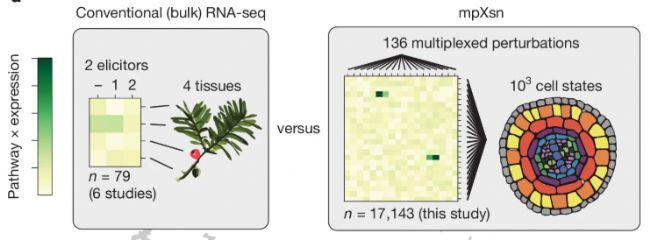 為解析完整的紫杉醇生物合成基因組,研究人員開發(fā)了一種新方法——多重?cái)_動(dòng) × 單核轉(zhuǎn)錄組(mpXsn)。該方法通過將不同處理?xiàng)l件下的樣本(如不同激素、微生物、誘導(dǎo)劑處理過的葉片)統(tǒng)一進(jìn)行單細(xì)胞水平轉(zhuǎn)錄組分析,從而在一個(gè)實(shí)驗(yàn)中高通量測(cè)試數(shù)百種“擾動(dòng)條件”,極大提高了 篩選效率 和基因表達(dá)模式的 分辨率。