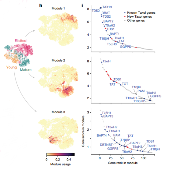 隨后,研究人員對(duì) mpXsn 數(shù)據(jù)集進(jìn)行深入分析,將紫杉醇生物合成基因劃分為3個(gè)獨(dú)立轉(zhuǎn)錄模塊:早期萜烯合成、中游氧化 和 后期修飾。其中,模塊1包含了紫杉醇合成早期通路的所有關(guān)鍵基因,如TDS、T5αH、TAT、T10βH 和 DBAT等。