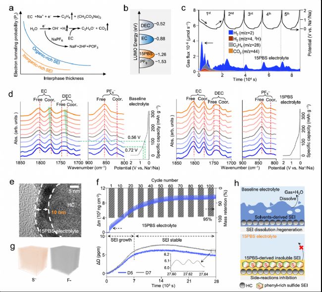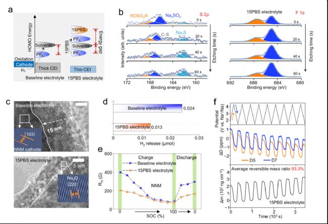 實驗結果顯示,當電解液中含有 15PBS 時,電極表面的頻率(Δf)和耗散(ΔD)變化顯著不同于傳統電解液。具體來說,15PBS 的存在抑制水催化電解液在電極表面的分解,且參與形成更加致密、均勻的富含硫化物的SEI 層。這種致密的 SEI 層有效地阻止了電解液與電極之間的直接接觸,從而抑制了電解液的過度分解及SEI的溶解和再生。
