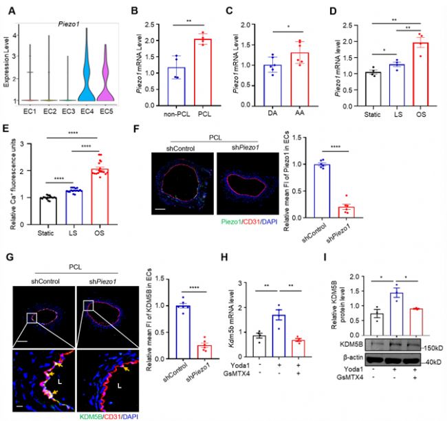 然后,為探究紊亂血流如何誘導內皮 KDM5B 表達,篩選了 shKdm5b HUVEC 中差異表達的機械傳感器,并分析了 PCL 術后左頸動脈(LCA)的 scRNA-seq 數據集。發現傳感器 Piezo1 主要表達于與紊亂血流相關的 EC4 和 EC5 亞群(圖 2A) ,且 PCL 術后左頸動脈及主動脈弓中的 Piezo1 mRNA 水平較血流保護區域顯著上調(圖 2B,C) 。體外實驗顯示,與靜態培養的 HUVEC 相比,層流和紊亂血流刺激均能上調 Piezo1 mRNA 表達及 Ca²⁺內流(圖 2D,E) 。通過基因和藥理學方法進一步研究發現,敲低 Piezo1 可降低頸動脈內皮 KDM5B 表達(圖 2F,G) ,而 Piezo1 激動劑 Yoda1 處理 HUVEC 可增加 KDM5B 表達,該作用可被阻斷肽 GsMTx4 抑制(圖 2H,I) ,證實 Piezo1 在紊亂血流條件下可通過調控鈣信號促進內皮 KDM5B 表達。