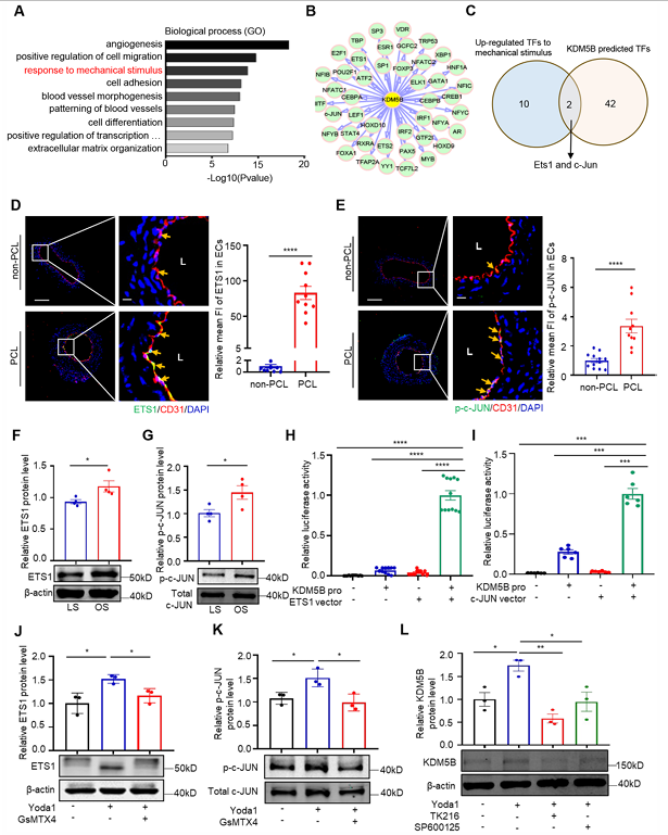 接下來,為了探究 Piezo1 如何調節紊亂血流(d-flow)誘導的 KDM5B 表達,研究人員首先通過 scRNA-seq 分析篩選出 PCL 手術 7 天后頸動脈內皮細胞中響應機械刺激的關鍵基因。經 GO 分析發現 12 個基因在 “機械刺激響應” 類別中顯著富集(圖 3A )。隨后利用生物信息學工具預測 KDM5B 轉錄因子,發現 44 個預測因子中 ETS1 和 c-JUN 與機械刺激響應基因重疊(圖 3B、C )。進一步通過免疫染色實驗證實,PCL 手術的左側頸動脈內皮細胞中 ETS1 和磷酸化 c-JUN 水平高于未手術的右側頸動脈(圖 3D、E) ,且暴露于振蕩切應力的人臍靜脈內皮細胞中這兩種分子的表達水平也顯著高于層流切應力條件下的細胞(圖 3F、G) 。這些結果表明,Piezo1 可能通過 ETS1 和 c-JUN 介導,在紊亂血流條件下調控內皮細胞中 KDM5B 的表達。