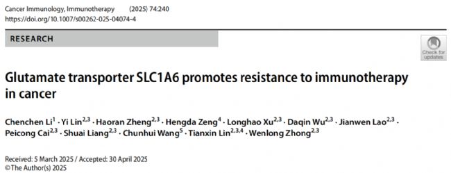 參考文獻:Li C, Lin Y, Zheng H, Zeng H, Xu L, Wu D, Lao J, Cai P, Liang S, Wang C, Lin T, Zhong W. Glutamate transporter SLC1A6 promotes resistance to immunotherapy in cancer. Cancer Immunol Immunother. 2025 Jun 7;74(8):240. doi: 10.1007/s00262-025-04074-4. PMID: 40481876; PMCID: PMC12145344.