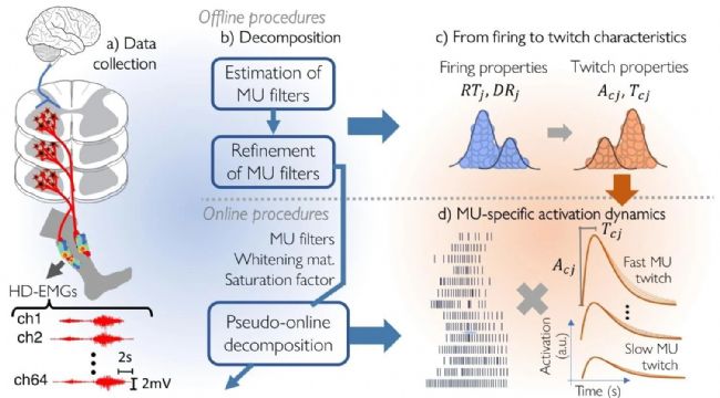 荷蘭特文特大學(xué) Massimo Sartori 教授團隊于2024年在IEEE BioRob會議上發(fā)布了一項開創(chuàng)性研究,首次提出一種可在線運行的神經(jīng)肌肉控制框架,可同時解碼行走與高強度收縮過程中的MU發(fā)放事件與相應(yīng)的肌肉激活狀態(tài)。研究采用兩階段盲源分離(BSS)策略,從低強度任務(wù)中訓(xùn)練MU濾波器,并遷移適配于高強度動態(tài)任務(wù),同時結(jié)合每個MU的“抽搐響應(yīng)函數(shù)”(twitch response)構(gòu)建個性化激活動力學(xué)模型。實驗顯示,該方法在行走任務(wù)中預(yù)測踝關(guān)節(jié)力矩的相關(guān)系數(shù)達0.89,明顯優(yōu)于傳統(tǒng)肌電(EMG)方法(0.86);同時,在90%最大自主收縮條件下,成功分解出多類型MU,具備亞10ms的低延遲運行效率。該研究為MU級別的人體運動意圖識別與智能控制提供了強有力支撐,或?qū)⑼苿游磥砀咝阅芸祻?fù)設(shè)備與神經(jīng)假體的發(fā)展。