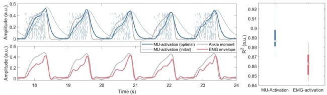 在步行任務(wù)中,通過解碼MU發(fā)放并結(jié)合個性化抽搐響應(yīng)構(gòu)建的激活動力學(xué)模型,預(yù)測出的踝關(guān)節(jié)力矩曲線與真實測量曲線擬合程度高達R²=0.89,顯著優(yōu)于傳統(tǒng)EMG包絡(luò)模型的R²=0.86(圖4)。這一結(jié)果說明該方法能更準確地反映生理實際肌肉控制機制,并成功捕捉到個體在自然運動中的神經(jīng)驅(qū)動模式。