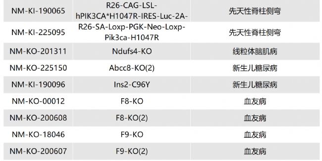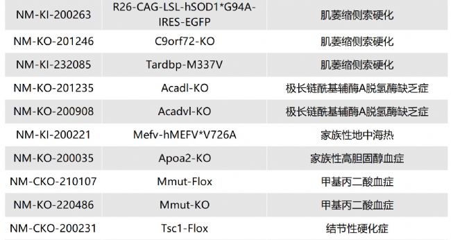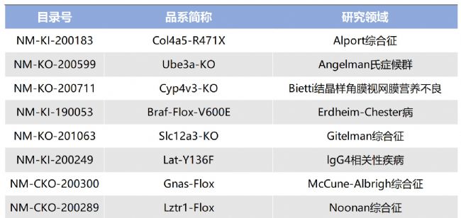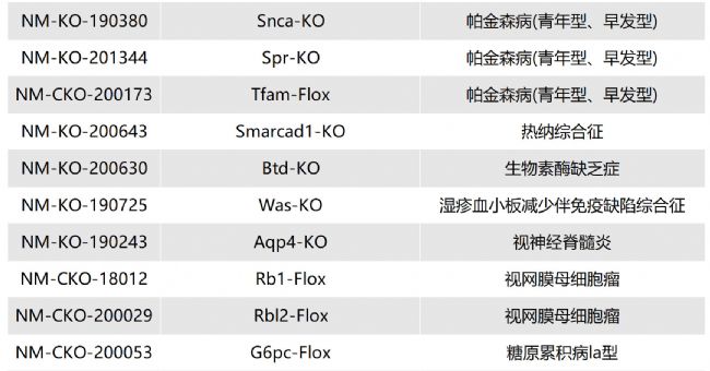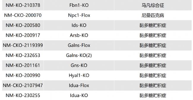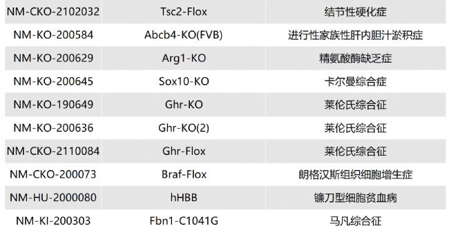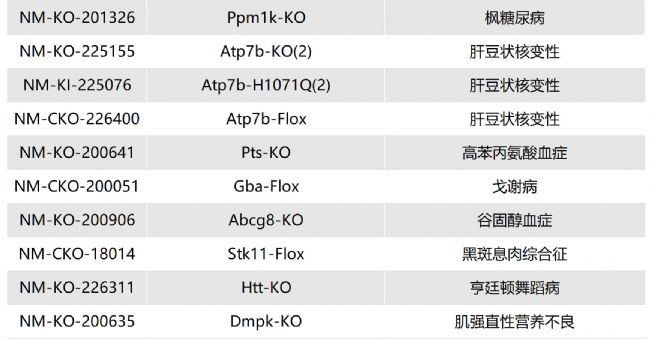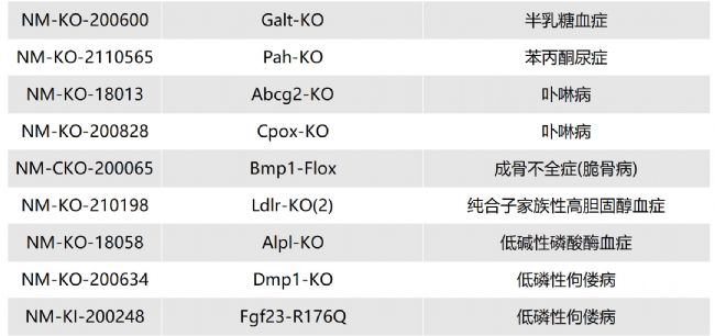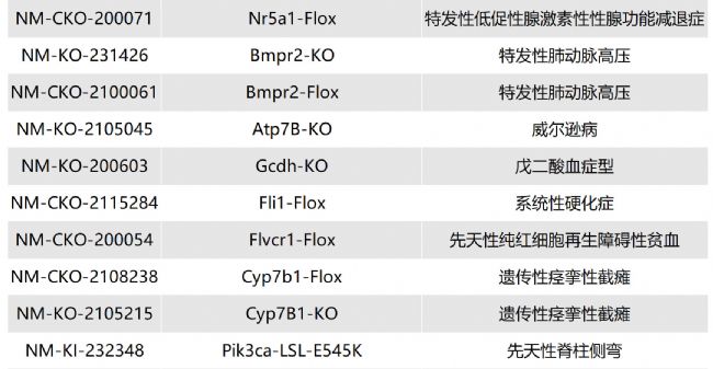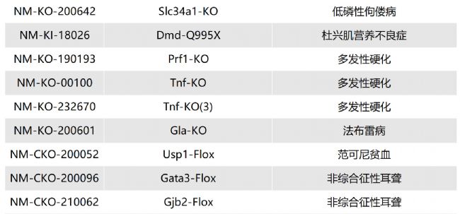南模生物開發了上百種罕見病相關小鼠模型,為罕見病的病理研究、藥效評估和藥物安全性評價提供了強有力的工具,部分品系信息如下: