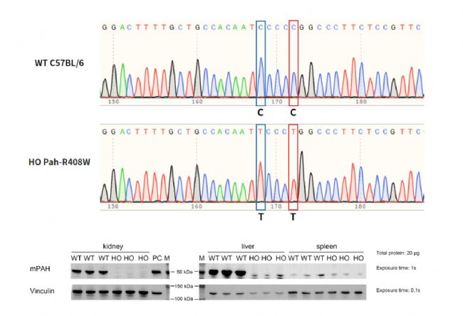 圖3. Pah-R408W小鼠中Pah基因的mRNA測序結果以及鼠源PAH蛋白的WB檢測結果。結果表明,Pah-R408W小鼠模型已出現PAH表達缺失。