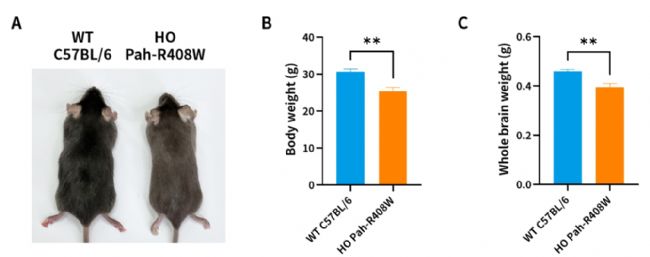 圖4. Pah-R408W小鼠模型體重、大腦重量相較野生型小鼠具有明顯降低。表明Pah-R408W小鼠模型表現出類似人類苯丙酮尿癥疾病的表型特征。