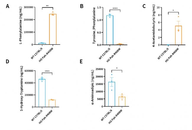 圖5. 液相色譜-質譜聯用技術(LC-MS)檢測Pah-R408W 小鼠血清中的氨基酸代謝物。結果顯示,與野生型(WT)小鼠相比:L-苯丙氨酸和4-乙酰氨基丁酸在Pah-R408W小鼠中顯著升高;而L-酪氨酸/L-苯丙氨酸比值、5-羥色胺和α-氨基己二酸在Pah-R408W小鼠中顯著降低。這表明在血清中的氨基酸代謝物水平上也模擬了人類相關表型。