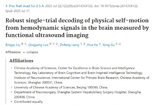 Liu B, Luo Q, Liang Z, He H, Gu Y. Robust single-trial decoding of physical self-motion from hemodynamic signals in the brain measured by functional ultrasound imaging. Proc Natl Acad Sci U S A. 2025 Jul 22;122(29):e2414354122. doi:10.1073/pnas.2414354122.
