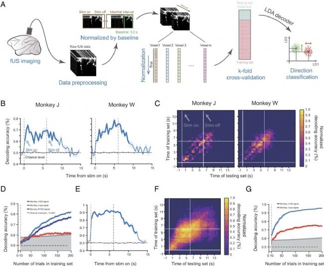 研究人員基于前人研究開發了單試次解碼算法(圖2A):先對圖像數據進行基線校正和跨試次歸一化,再采用線性判別分析(LDA)分類運動方向,并通過10折交叉驗證防止過擬合。結果顯示,兩只獼猴均能實現可靠單試次解碼(圖2B):獼猴J解碼準確率顯著高于隨機水平(P<0.001),峰值達74.12%;獼猴W同樣保持全程顯著,峰值78.5%。跨時間解碼分析(圖2C)表明解碼效能集中于刺激時段,排除了歷史數據或預期信號的干擾。訓練集規模測試顯示(圖2D),當試次超過31次(獼猴J)或39次(獼猴W)時,解碼準確率顯著提升,峰值分別達82.1%和76.95%。