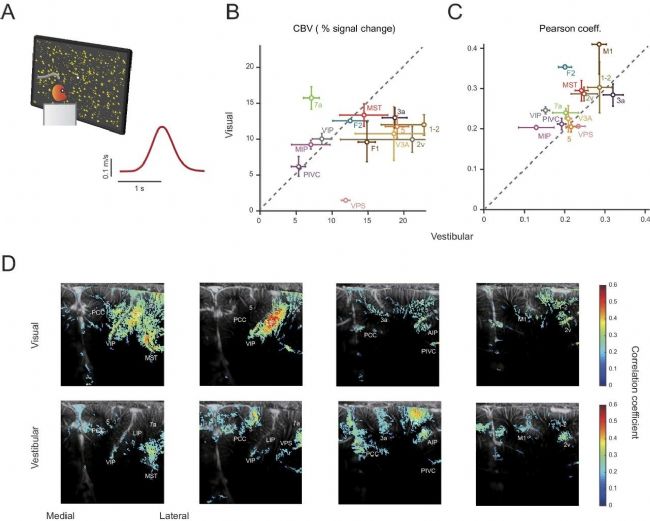 結合視覺光流實驗,發現12個雙模態腦區(如MSTd、VIP),證實前庭與視覺信號的交互。