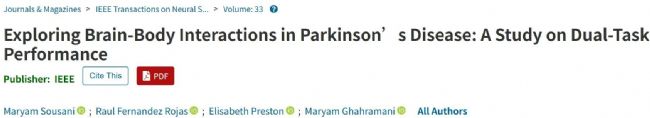 Sousani M, Fernandez Rojas R, Preston E, Ghahramani M. Exploring Brain-Body Interactions in Parkinson's Disease: A Study on Dual-Task Performance. IEEE Trans Neural Syst Rehabil Eng. 2025;33:984-993. doi: 10.1109/TNSRE.2025.3546278. Epub 2025.