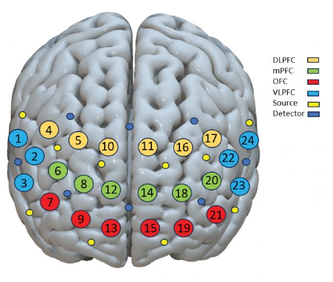 在功能性近紅外光譜分析中,數據處理主要圍繞兩種情況展開:一是計算每個任務期間所有通道的平均值,以此關注任務期間前額葉皮層的激活情況;二是通過對前額葉皮層內背外側前額葉皮層(DLPFC)、腹外側前額葉皮層(VLPFC)、內側前額葉皮層(mPFC)和眶額皮層(OFC)這四個不同感興趣區域進行比較分析,研究兩組受試者前額葉皮層每個子區域與運動指標之間的關系。