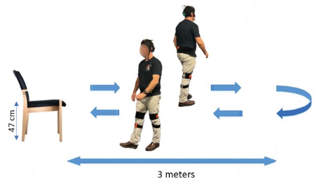 圖3. 一名佩戴功能性近紅外光譜(fNIRS)帽并配備慣性測量單元(IMU)傳感器執行計時起立行走(TUG)測試的參與者