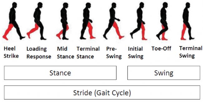 圖4. 人類步態周期(GC)及不同步態事件:腳跟觸地(HS)、擺動、支撐和腳趾離地(TO)