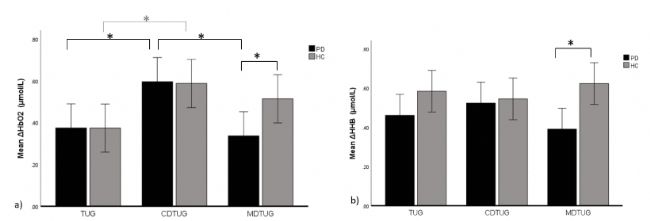 PD 組中,TUG 期間 ΔHBO 與步頻呈負相關,與步時間呈正相關,MDTUG 期間坐站持續時間與 ΔHBO 有顯著相關,TUG 期間 ΔHHB 的增加與步幅時間和轉身持續時間呈正相關。