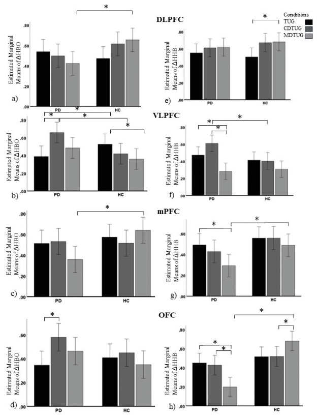 圖7. 健康對照組(HC)和帕金森病(PD)組在計時起立行走測試(TUG)、認知雙任務a TUG 測試(CDTUG)及運動雙任務 TUG 測試(MDTUG)期間,不同感興趣區域(ROIs)的氧合血紅蛋白變化量(∆HBO)和脫氧血紅蛋白變化量(∆HHB)對比。