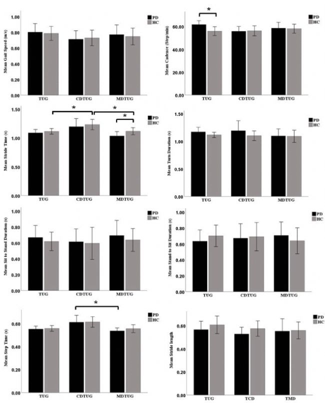 PD 組內 CDTUG 和 MDTUG 之間的步時間有顯著差異;HC 組中 CDTUG 期間的步幅時間最高,與其他條件有顯著差異(見圖8)。