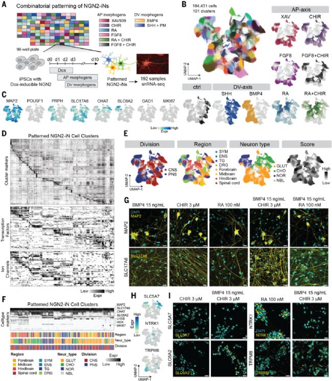 (A) NGN2-iN組合模式化篩選實驗設計與時間線,采用單細胞轉錄組測序(snRNA-seq)結合分池組合條形碼技術(Parse Biosciences)分析192種形態發生素組合。(B) 184,431個細胞的UMAP降維圖,按細胞簇(左)和AP/DV形態發生素來源(右)著色。(C) 代表性標志基因表達特征圖。(D) 模式化NGN2-iN細胞簇的標記基因、轉錄因子和離子通道表達熱圖。(E) 基于原代神經元參考圖譜注釋的UMAP圖,顯示神經系統分區(左上)、區域(右上)、神經元類型(左下)和匹配評分(右下)。縮寫:CNS中樞神經系統;PNS外周神經系統;SYM交感神經系統;ENS腸神經系統;TG三叉神經節;DRG背根神經節;GLUT谷氨酸能神經元;CHO膽堿能神經元;NOR去甲腎上腺素能神經元;NBL神經母樣細胞。(F) 模式化NGN2-iN各細胞簇的代表性標志基因熱圖,側邊欄顯示轉移注釋。(G) 第6周模式化NGN2-iN與星形膠質細胞共培養的免疫熒光染色,MAP2(上排)和SLC17A6(下排)呈黃色,DAPI呈青色。比例尺:20μm。(H-I) 第10天模式化NGN2-iN的亞型特異性標志物特征圖(H)和免疫熒光染色(I),包括SLC5A7、SLC6A2、NTRK1和TRPM8。比例尺:20μm。
