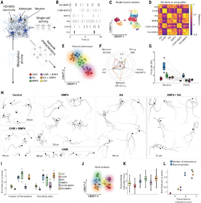 這篇研究通過系統篩選480種形態發生素組合,結合單細胞測序、高密度微電極陣列(HD-MEA)等技術,在人類干細胞中建立了定向誘導多樣化神經元亞型的普適性策略。