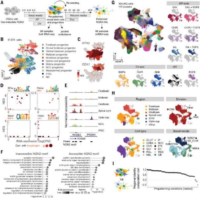 (A) 預模式化篩選與NGN2誘導實驗設計。(B) 預模式化神經干/祖細胞UMAP圖,按注釋著色。(C) 按可及區域基序富集[NES]著色的UMAP圖。(D) 基序富集與TF表達相關性散點圖。(E) NGN2基序可及性差異的ATAC峰示例。(F) NGN2基序可及/不可及關聯基因的GO分析。(G-H) 304,912個預模式化NGN2-iN細胞的UMAP圖,按簇身份/形態發生素來源(G)或原代注釋/基礎培養基(H)著色。(I) 預模式化神經干/祖細胞與NGN2-iN的神經身份組成相關性,每點代表一個形態發生素組合。