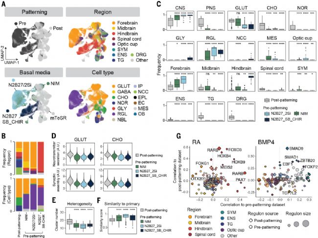 (A) 整合數據集489,343個細胞的UMAP圖。(B-C) 區域身份(B)和細胞類型(C)頻率組成比較。(D) 基于神經遞質分泌和突觸組裝相關基因的成熟度比較。(E-F) 異質性(E)和原代相似性(F)比較。(G) 預/后模式化調控子與RA/BMP4活性的相關性比較,點大小示調控子規模。