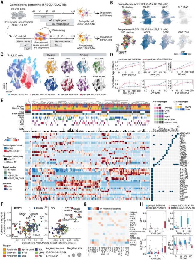 (A) ASCL1/DLX2誘導的預/后模式化篩選設計。(B) ASCL1/DLX2-iN的UMAP圖。(C) 430,936個神經細胞的整合圖譜UMAP。(D) 形態發生素濃度與轉錄差異的散點圖。(E) 基于轉錄組距離的聚類樹狀圖,熱圖示各簇最佳條件的濃度,條形圖示簇純度。(F) NGN2與ASCL1/DLX2-iN調控子與BMP4/RA相關性比較。(G) 形態發生素對神經遞質/神經肽基因表達的隨機森林預測重要性熱圖。(H) 神經遞質/神經肽表達與形態發生素濃度的箱線圖。
