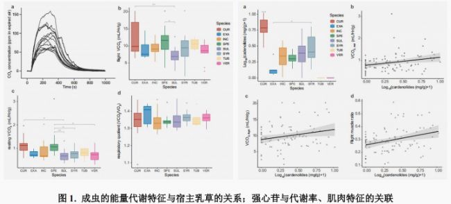 帝王蝶的北美種群具有長達數千公里的季節性遷徙行為,是昆蟲中遷徙距離最長的物種之一。人類為了保護這一瀕危物種,會在其遷徙路線種植幼蟲取食的多種乳草。賓夕法尼亞州立大學昆蟲系的科研團隊研究了8種不同乳草培養下帝王蝶飛行肌肉發育、能量代謝等參數的變化,其中熱帶乳草和華麗乳草組成蟲的飛行代謝率(FMR)顯著高于草原乳草組;華麗乳草組成蟲靜止代謝率(RMR) 顯著高于草原乳草、輪生乳草和普通乳草組。帝王蝶幼蟲宿主乳草種類通過改變帝王蝶的飛行肌肉占比和強心苷積累,顯著影響成年帝王蝶的能量代謝特征,比如熱帶乳草和華麗乳草雖然能促進更高的肌肉發育,但會導致更高的能量消耗,可能對長距離遷徙不利;而普通乳草、草原乳草等則支持更經濟的能量需求,更適合帝王蝶種群的遷徙。