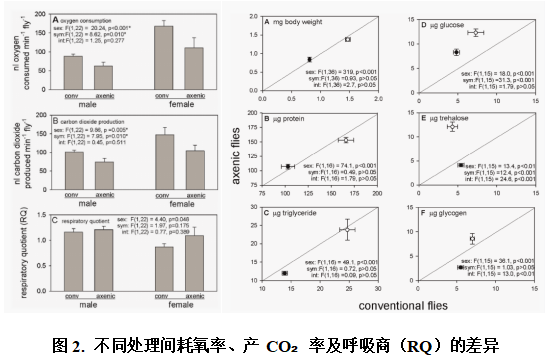 動物常駐微生物群(尤其是腸道菌群)對宿主營養加工、代謝信號及健康至關重要,但哺乳動物菌群復雜(數百種,多不可培養),研究難度大。英國約克大學生物學系的研究團隊以果蠅為樣品探究常駐微生物群對果蠅營養表型(生長、營養狀態、代謝)的影響。其中無菌果蠅幼蟲發育時間顯著延長,而存活率、成年體重、雌性產卵量無顯著差異。無菌果蠅的耗氧率和產CO₂率顯著低于常規果蠅,雌性高于雄性;雌雄呼吸商均接近 1,表明主要呼吸燃料為葡萄糖。其中無菌果蠅幼蟲發育延長可能因微生物缺失導致營養獲取效率降低,而成年體型無差異說明幼蟲臨界體重后的生長不受影響,提示微生物作用主要在臨界體重前階段。這表明果蠅常駐微生物群雖非生存必需,但通過促進幼蟲生長、調節碳水化合物分配及能量穩態,顯著影響宿主營養表型,揭示動物營養表型需結合宿主 - 微生物群相互作用機理。