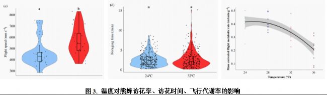 昆蟲中傳粉者對野生植物群落和農業生產力至關重要,但全球范圍內其豐度和多樣性正下降。氣候變暖是傳粉昆蟲的主要威脅之一,可影響昆蟲發育、形態、代謝及行為。瑞典科學團隊從溫度變化入手,研究氣候變暖條件下熊蜂覓食行為及代謝機制的變化。實驗結果顯示飛行代謝率隨溫度升高而顯著降低。其中高溫下熊峰的飛行代謝率降低可能是因為肌肉預熱耗能減少,使熊蜂能更快飛行、更多訪花而不增加能耗;但高溫也會引發熱應激,導致單蜂覓食次數減少。這種覓食行為的改變可能會破壞植物 - 傳粉者互作,雖然高溫下熊蜂訪花更頻繁,但可能因訪花時間短導致花粉傳遞不足;且單蜂覓食次數減少、更多工蜂參與覓食可能降低蜂群效率(如哺育),間接影響植物授粉成功率。
