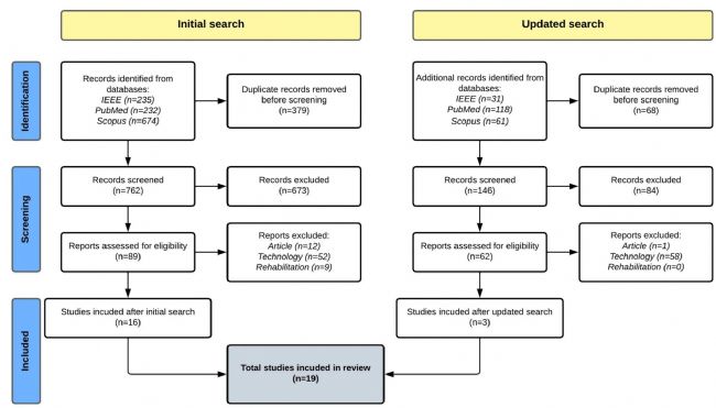 遵循 PRISMA 指南,對功能性神經成像和運動捕捉結合用于運動康復的相關文獻進行綜述(圖2)。提取的內容包括研究和參與者特征、所用系統的技術方面、信號處理方法以及多模態特征同步和融合的性質。