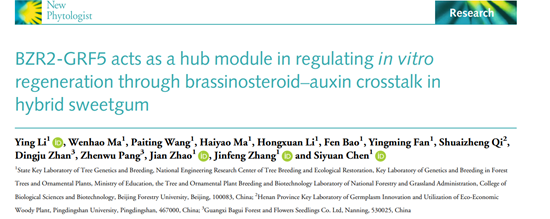 木本植物離體再生是種質資源擴繁、保存及遺傳改良的關鍵技術,主要通過體細胞胚胎發生(SE)和器官發生兩條途徑實現。楓香是重要林木資源,雜交楓香因生長快、木材密度高,具有顯著雜種優勢,但其再生體系存在愈傷誘導率低、芽再生效率低等問題。油菜素內酯(BR)與生長素是調控植物再生的關鍵激素,BZR轉錄因子通過靶向生長素信號組分(如PIN, ARF)影響激素合成與運輸。此前研究發現外源epiBR需與生長素聯用才能誘導雜交楓香SE,提示BZR基因可能是再生通路的關鍵調控因子,但其作用機制尚不清楚。