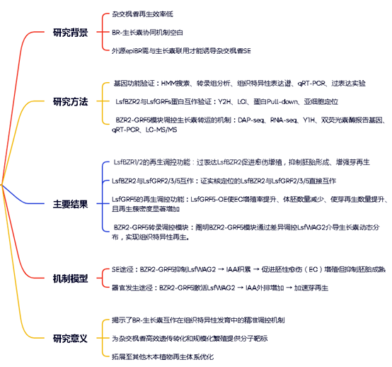 本研究首次建立了雜交楓香中BR-生長素信號互作的分子調控模型:BZR2-GRF5模塊通過差異化調控LsfWAG2表達,在SE中維持高生長素環境促進愈傷增殖,在器官發生中降低生長素水平以加速芽再生,形成組織特異性的雙向調控機制。這一發現為木本植物再生效率的遺傳改良提供了新靶點,并揭示了BR-生長素互作在組織特異性發育中的精準調控機制。