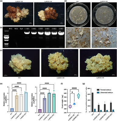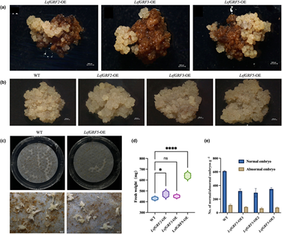 為了進一步驗證BZR2-GRF5模塊功能,構建了LsfBZR2及LsfGRF5過表達株系。表型分析表明,LsfBZR2-OE、LsfGRF5-OE株系均表現為鮮重增加;體細胞胚胎數量減少,且異常胚胎比例顯著升高;再生芽生長速率加快且形成密集芽簇。qRT-PCR顯示過表達株系基因表達顯著上調,且植株表型正常,證實該模塊對器官發生有正向調控作用。