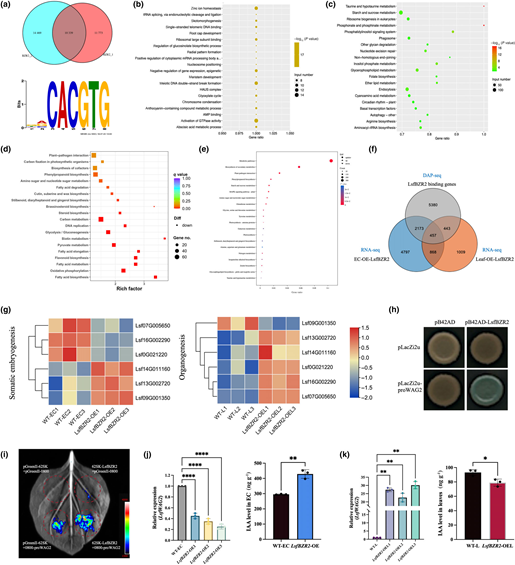 為了鑒定LsfBZR2調控的下游基因,作者采用DNA親和純化測序(DAP-seq)技術來識別該轉錄因子結合的基因組DNA元件。結果顯示LsfBZR2在36,582個基因組位點高度富集,涵蓋8,454個基因。其中12.2%位于啟動子區域,核心結合基序為‘CACGTG’。GO富集結果表明,與LsfBZR2蛋白結合位點相關的基因主要富集在鋅離子穩態維持、分生組織發育、表觀遺傳學、減數分裂、乙醛酸循環和脫落酸代謝途徑。與RNA-seq數據聯合分析篩選出457個受LsfBZR2調控的差異基因,其中生長素外排載體基因LsfWAG2(Lsf07G005650)被確認為直接靶基因。qRT-PCR與LC-MS/MS結果顯示,在SE途徑中,LsfBZR2過表達抑制LsfWAG2表達,導致IAA積累,促進愈傷增殖;在器官發生途徑中,LsfBZR2激活LsfWAG2表達,加速生長素外排使IAA水平降低,從而促進芽原基形成。酵母單雜交(Y1H)與雙熒光素酶報告實驗(DLR)證實,LsfBZR2直接結合啟動子區并調控其轉錄活性。