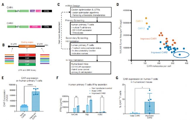 優化CAR(抗CD19)mRNA的UTR和密碼子,使表達效率提升10倍,功能更強(細胞毒性、增殖、細胞因子釋放)。
