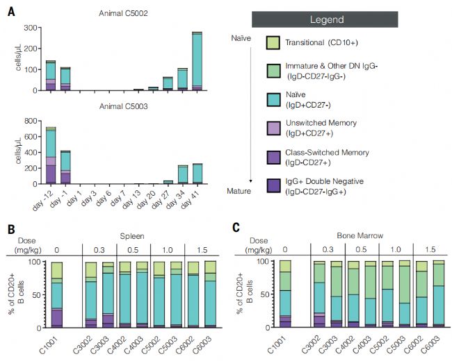 3次給藥(0.5–2.0 mg/kg)可深度清除B細胞(外周血、脾臟、淋巴結),CAR+ CD8+ T細胞峰值達85%。