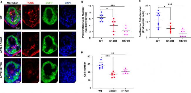 研究人員對(duì)ACTA2過(guò)表達(dá)(OE)模型進(jìn)行了深入的組織病理學(xué)評(píng)估,結(jié)果揭示了在攜帶ACTA2致病突變的斑馬魚(yú)中,心內(nèi)膜和心肌區(qū)域的增殖細(xì)胞數(shù)量相較于野生型斑馬魚(yú)顯著減少(見(jiàn)圖3)。這一增殖細(xì)胞的減少直接導(dǎo)致了心肌細(xì)胞數(shù)量的明顯下降,進(jìn)而使得心肌壁變得更為薄弱。這些病理變化與左心室致密化不全(LVNC)及心臟缺陷的發(fā)展緊密相關(guān),深刻揭示了ACTA2致病突變對(duì)心臟結(jié)構(gòu)與功能產(chǎn)生的深遠(yuǎn)影響。值得注意的是,這些實(shí)驗(yàn)結(jié)果與人類患者中ACTA2變異所展現(xiàn)出的心臟異常現(xiàn)象高度一致。