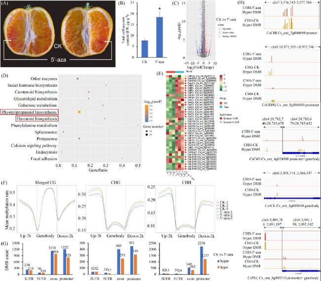 近日,浙江省農科院亞熱帶作物研究所張培安助理研究員為第一作者、劉冬峰副研究員為通訊作者,在《BMC Plant Biology》雜志發表題為“Identification of key genes controlling anthocyanin biosynthesis in the fruits of a bud variety of Tarocco blood-orange”的研究論文,研究聚焦中國常見的血橙(蕓香科柑橘屬)品種Tarocco及其在溫州發現的芽變品種Ouya(MT),討論了MT果實中花青素生物合成受抑制的品質特性及分子機制。研究結果表明,MT果實具有更優的糖酸比、更大的果實重量和尺寸,且成熟期比WT提前約1個月,具備較高的推廣價值。在分子水平上,研究人員鑒定出多個與花青素合成相關的差異表達基因、轉錄因子和甲基化相關基因,并通過WGBS+RNA-seq聯合分析,驗證了DNA甲基化在花青素積累中的調控作用。這些發現不僅為血橙果實品質改良提供了新的基因資源和靶點,也為其他柑橘品種的遺傳改良提供參考。