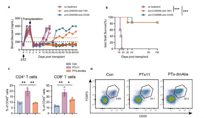 | 目標(biāo) | ● 問(wèn)題描述:在胰島移植中,免疫系統(tǒng)攻擊移植物導(dǎo)致失敗,尤其是異體移植(如BALB/cJ到C57BL/6J小鼠)。傳統(tǒng)方法依賴免疫抑制劑,但長(zhǎng)期使用會(huì)引起副作用(如感染風(fēng)險(xiǎn)增加)。 ● 解決方案:采用雙抗體療法阻斷T細(xì)胞活化通路。 a、使用抗CD45RB和抗TIM-1或抗CD40L抗體組合(Bio X Cell產(chǎn)品),在移植后第0、1、3、5、7天腹腔注射。 b、效果:誘導(dǎo)調(diào)節(jié)性T細(xì)胞(Treg)擴(kuò)增,顯著減少CD4+/CD8+ T細(xì)胞在腎臟的浸潤(rùn),83%受體小鼠實(shí)現(xiàn)長(zhǎng)期血糖控制(>100天)。 |