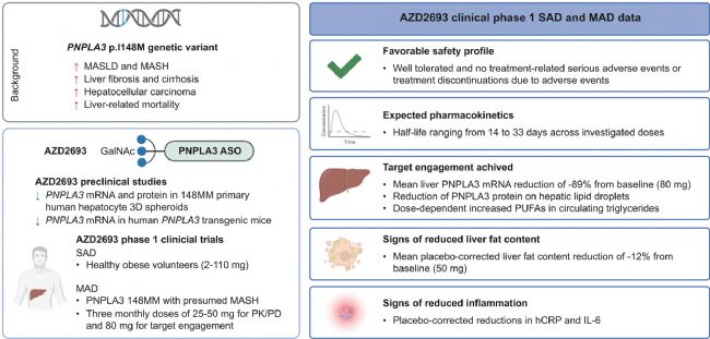 寡核苷酸藥物:通過RNA干擾(如反義寡核苷酸、siRNA)降低PNPLA3突變蛋白表達,可改善肝臟脂肪變性和炎癥。阿斯利康最近公布了AZD2693注射液的最新結果:AZD2693能有效降低肝臟 PNPLA3 mRNA(−89%)和肝脂滴上的蛋白質水平。在臨床應用上,總體耐受性良好,沒有出現因不良事件導致停藥的情況,也未發生與治療相關的嚴重不良事件。