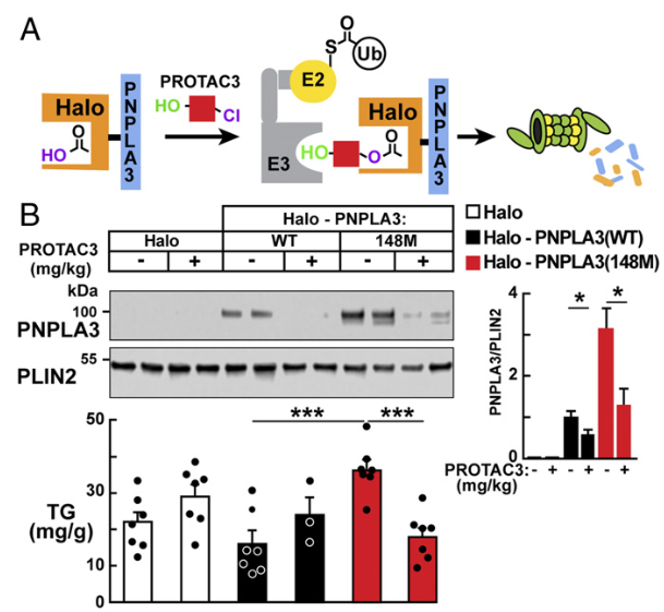 蛋白降解:盡管目前尚無基于PROTAC(蛋白水解靶向嵌合體)技術的藥物,但一項關鍵臨床前研究成功開發了靶向PNPLA3的降解劑PROTAC 3。該分子結構包含兩個關鍵域:E3泛素連接酶招募域和靶蛋白結合域。結果表明,在表達人源PNPLA3 148M突變蛋白的小鼠肝臟中,PROTAC 3處理顯著降低突變蛋白水平,并改善了與突變蛋白表達相關的脂肪肝病。
