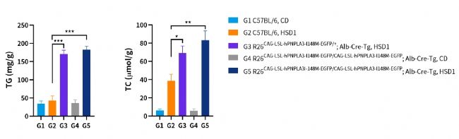 圖6. HSD誘導6周后各組小鼠肝臟中甘油三酯(TG)和總膽固醇(T-CHO)含量。結果顯示,HSD飲食誘導下,肝臟特異性過表達hPNPLA3 I148M小鼠TG、T-CHO含量顯著增加。
