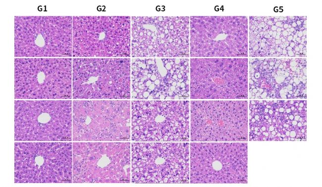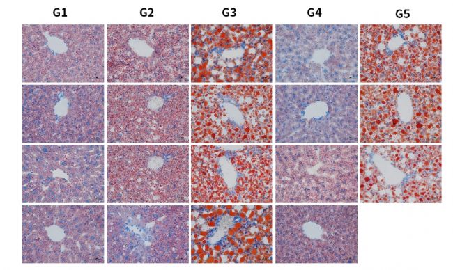 圖7. HSD誘導6周后各組小鼠H&E染色代表圖。結果顯示,HSD飲食誘導下,肝臟特異性過表達hPNPLA3 I148M小鼠出現明顯脂肪空泡(G3,G5)。